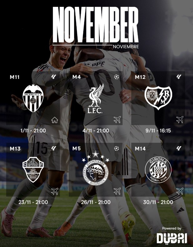 皇马官方晒11月赛程:主场作战 战瓦伦西亚后将迎5连客,含客战利物浦