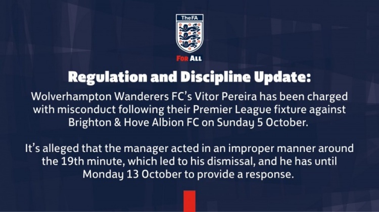 官方:狼队主帅佩雷拉被指控行为不当,需在10月13日前作出回应