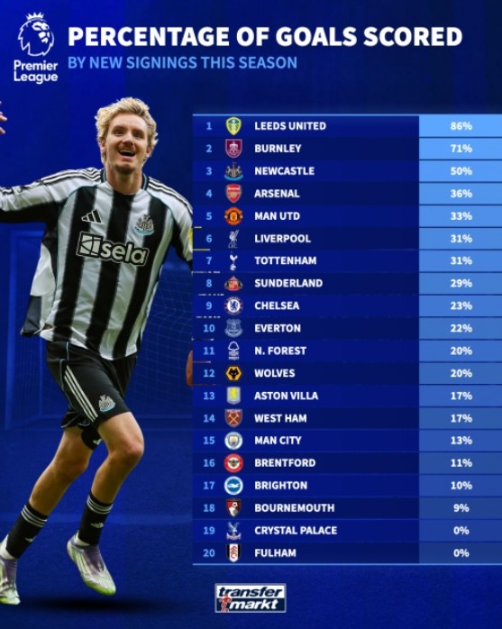 英超各队新援得分 占球队总得分 比例:利兹联86%最高,阿森纳第4