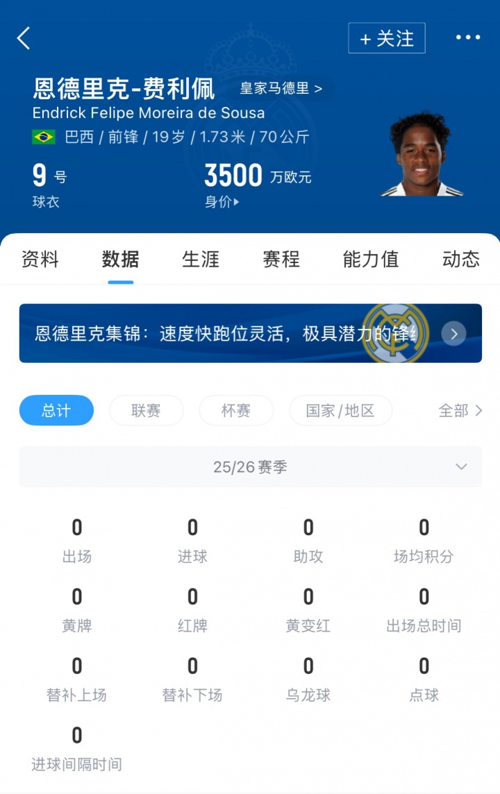 自2024年夏天以4750万欧的转会费正式登陆皇马以来,恩德里克一直鲜有表现机会,身价经历连续两次下跌后来到3500万欧。如何在经历受伤 等一系列因素后摆脱这一低谷是恩德里克在皇马需要面对的难题。