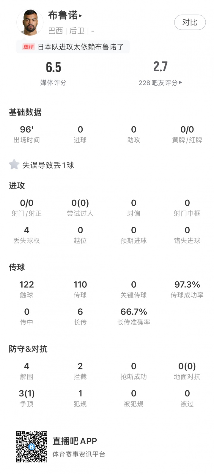 此役,巴西杆位中卫布鲁诺上演灾难级别表现,苏超直播先是腿软送对手单刀赴会,此后又解围时不慎爆射自家古代足球 门 ,直接帮助日本队完成让二追三。