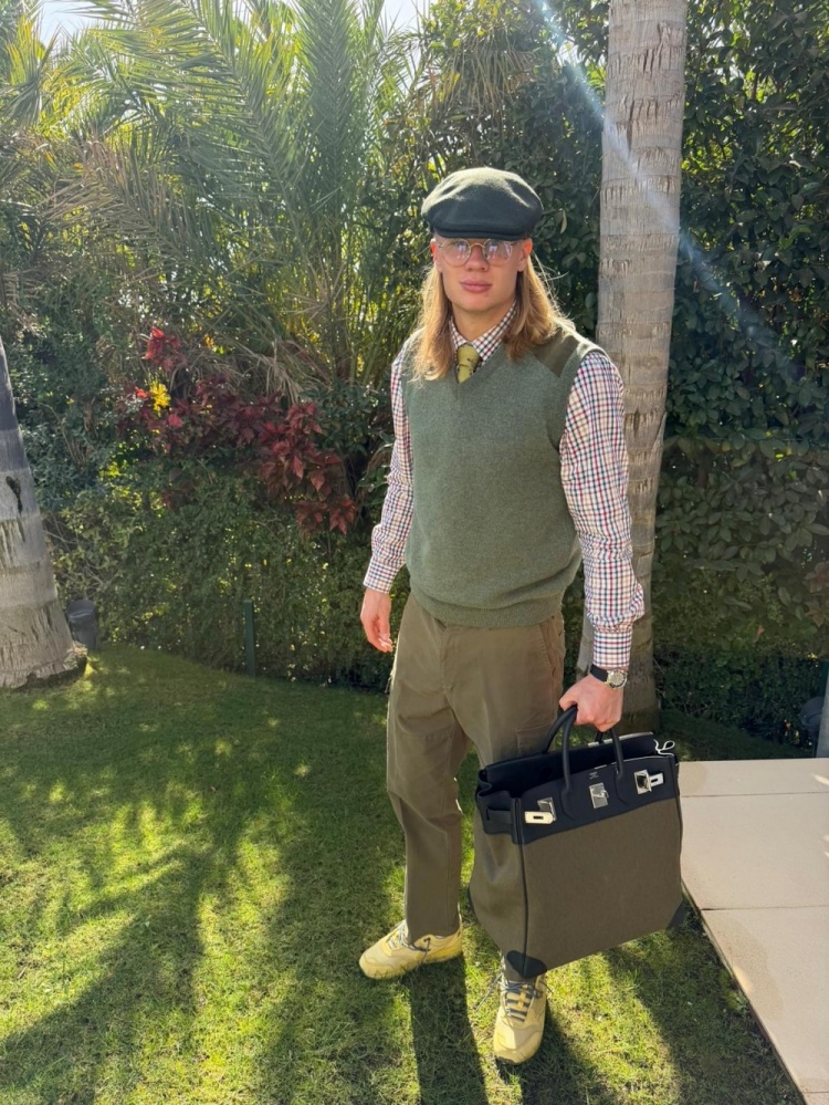 哈兰德社媒晒出穿搭照片,背景是郁郁葱葱的绿色植被,哈兰德头戴绿色帽子,身上穿着绿色马甲,苏超在线直播高清视频无插件内搭格子衬衫,下身穿着橄榄绿裤子,手拎黑绿色帆布包包。