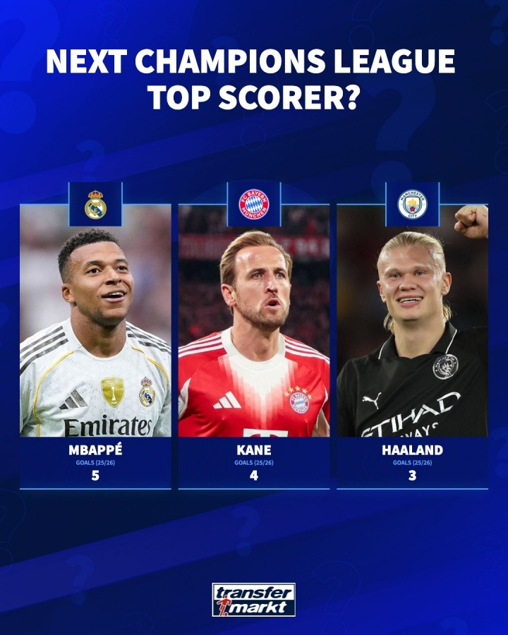 谁将夺得金靴?欧冠射手榜:姆巴佩2轮5球领跑,凯恩4球哈兰德3球