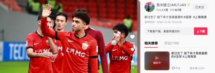 10月22日讯 亚冠精英职业联赛 第三轮,上海海港主场作战 0-2不敌町田泽维亚。赛后,海港球员吾米提江更新了个人社交媒体。