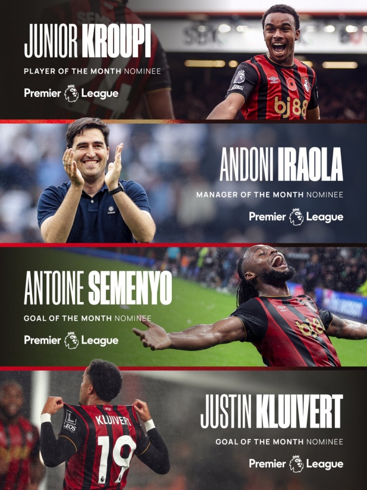 表现优异!伯恩茅斯入围英超10月最佳指导教练员、最佳球员、最佳得分