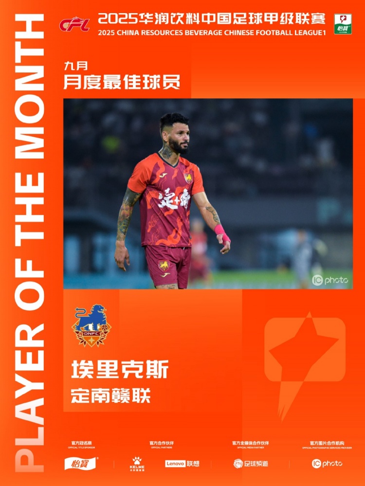 中甲官方:定南赣联外援埃里克斯获9月最佳球员,出战4场进4球