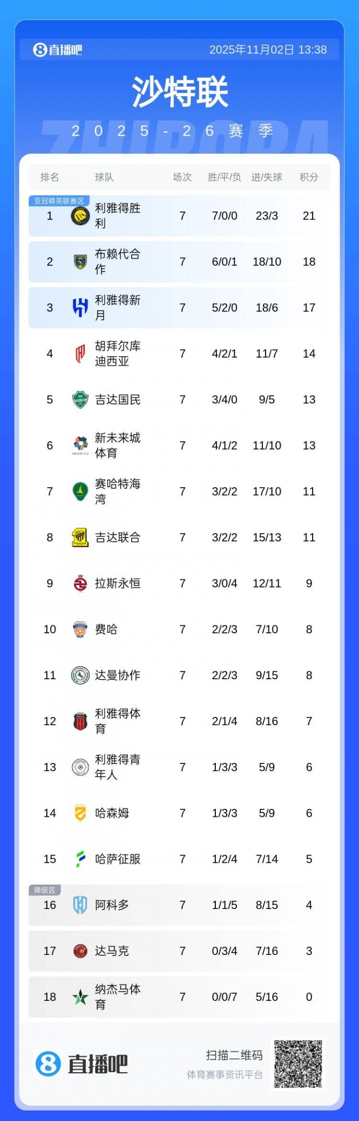 此役过后蝉联第一名 第一名 吉达联合排名沙特联第8,本赛季他们的发挥很一般,上赛季的大腿本泽马缺席多场赛事 。