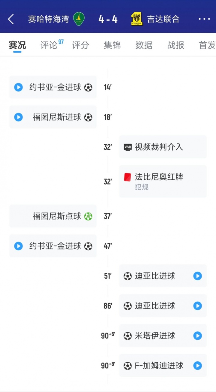 炸裂😨10人吉达联合上演半场让4追4,补时连进2球贡献逆天绝平